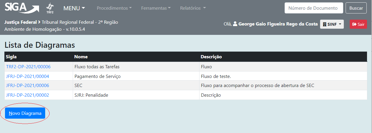 3 – Será a apresentada a lista de diagramas que já foram criados. Clique no botão “Novo Diagrama”.