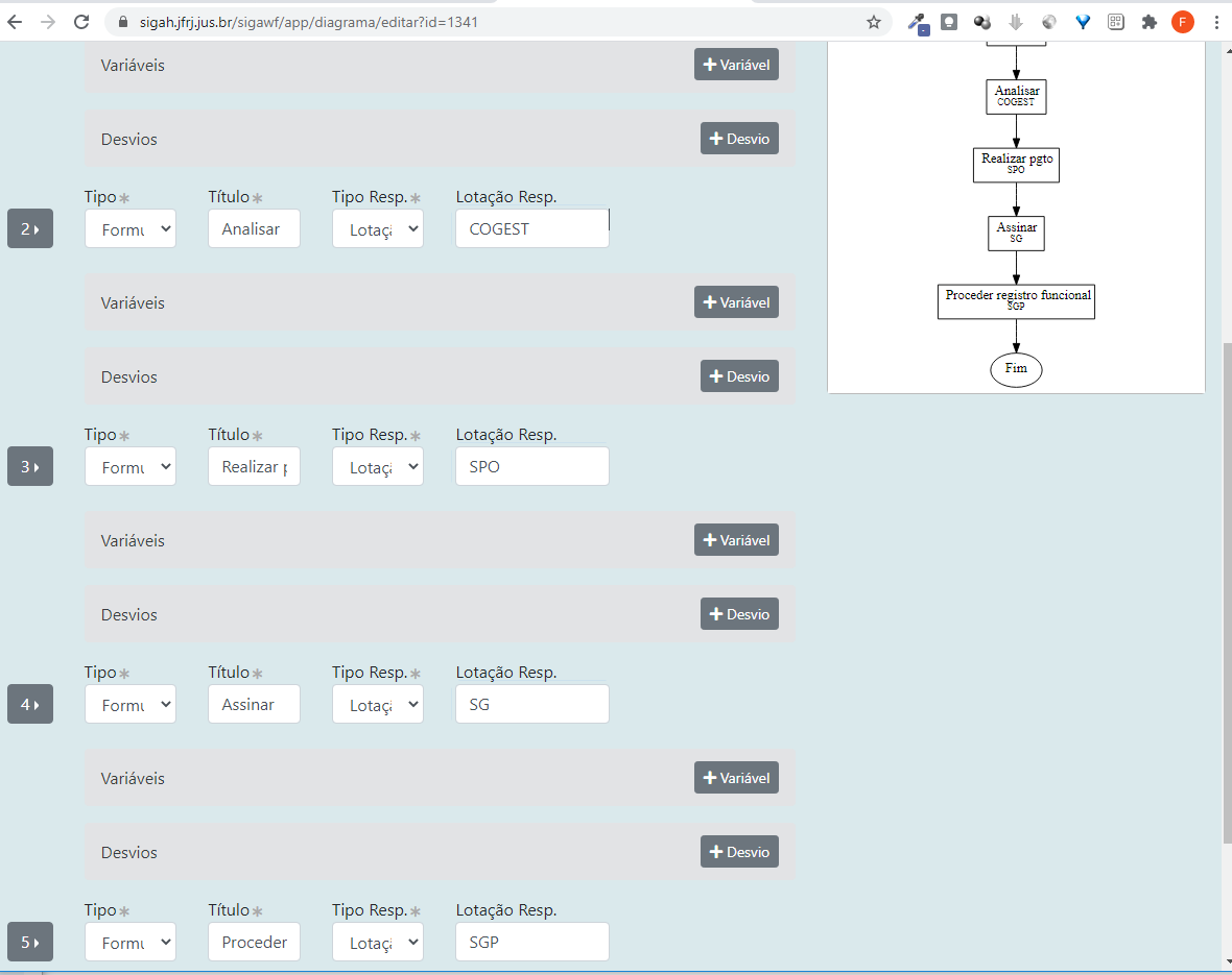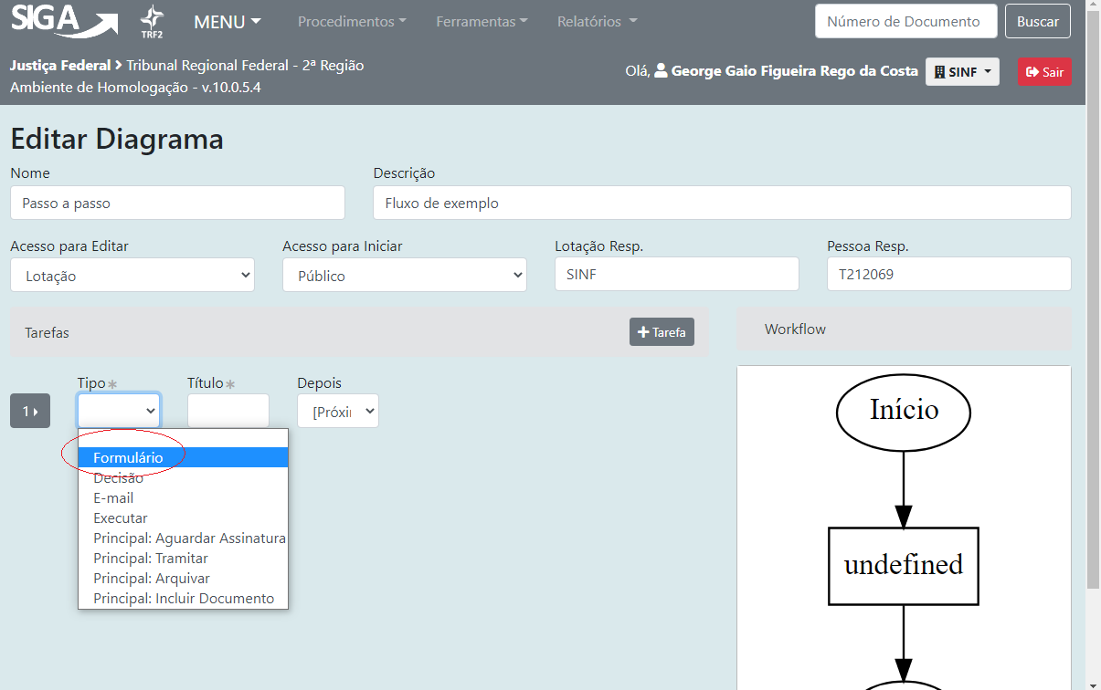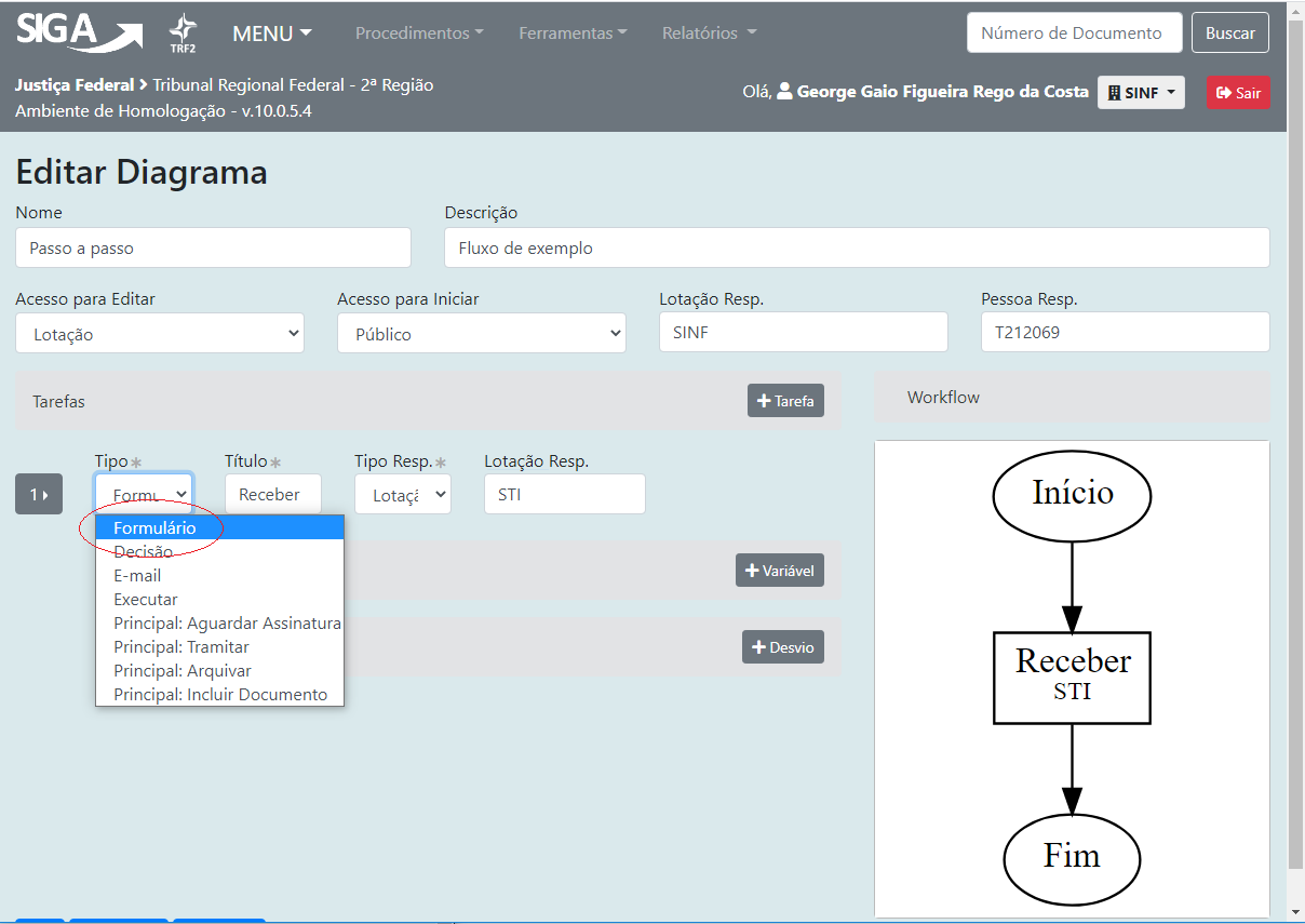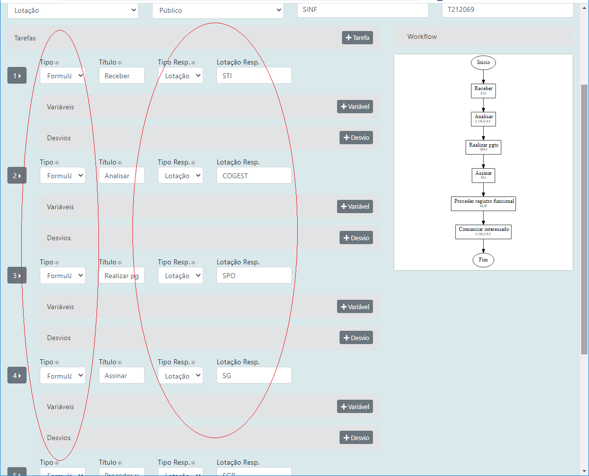 7 - Para esse fluxo de exemplo, vamos trabalhar apenas com tarefas do tipo "Formulário", que representam uma tarefa a ser executada pelo usuário. Selecione então o tipo "Formulário" em todas as tarefas, preenchendo também a respectiva lotação responsável pela execução tarefa, conforme abaixo