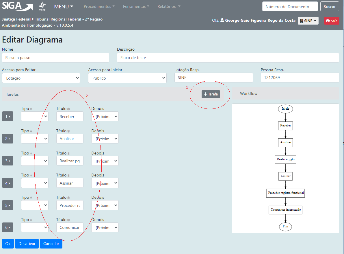 Repare que o diagrama do fluxo que está sendo criado é exibido no lado direito. O sistema já insere automaticamente os eventos de Inicio de Fim. Não sendo definido um desvio para cada tarefa, o sistema automaticamente considera que a tarefa seguinte é a próxima da lista, o que vamos ajustar posteriormente.